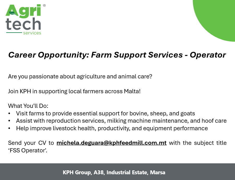 KPH Group is seeking a dedicated Farm Support Services Operator to join its Agritech team. The role involves conducting farm visits across Malta to deliver essential livestock support services, including reproduction assistance, milking machine maintenance, and hoof care, aimed at improving animal health and productivity.